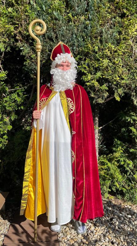 Karnevalový kostým Mikuláš velikosti L obsahuje: košile, plášť s ornamentem, čepice.